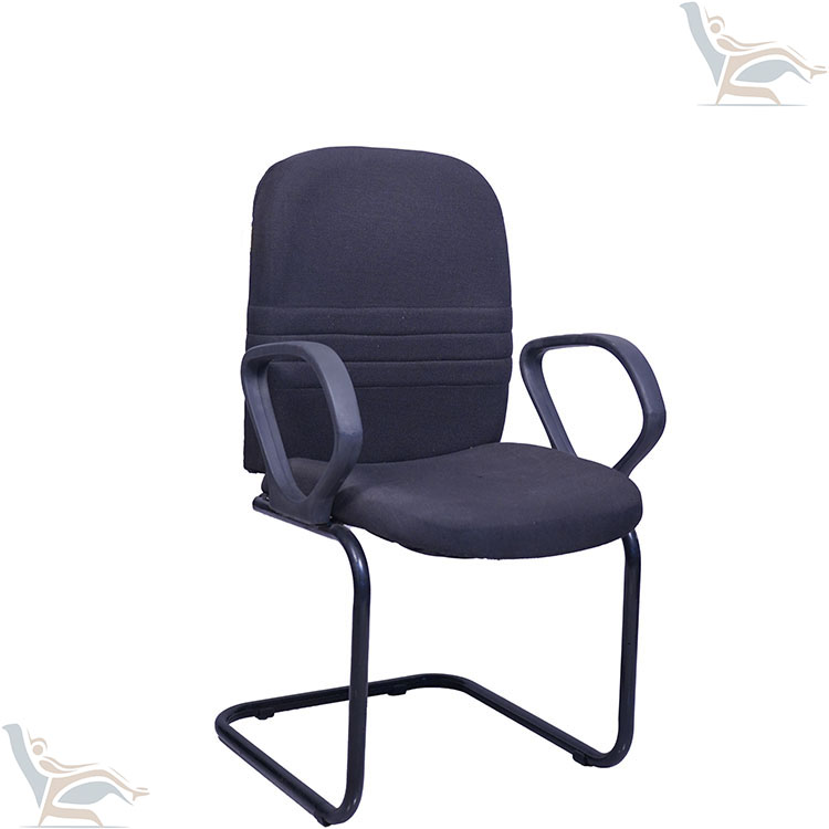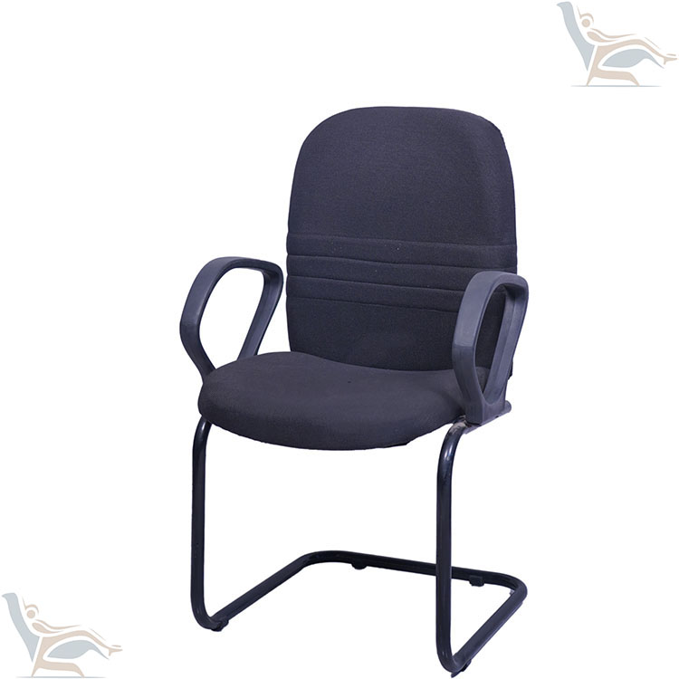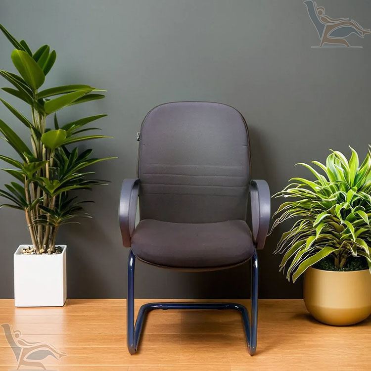 Introducing Luna: a stylish fabric office chair with cushioned upholstery, fixed armrests, and a sleek design for comfortable, stationary seating.
