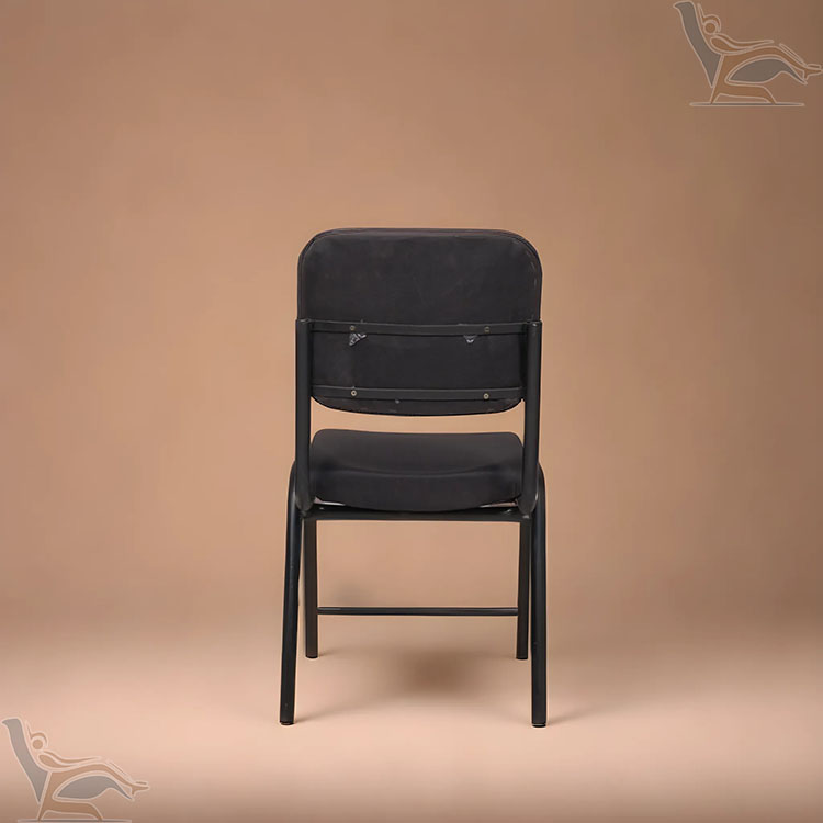 Introducing a black cushioned chair with a sturdy metal frame, fixed foot and armrests, perfect for visitors and students.